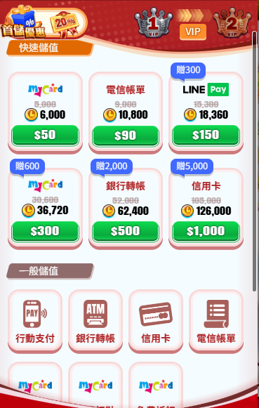 不過,要是你是那種已經準備好長期駐守,甚至有意往VIP階層邁進的重度玩家,那麼中高額的儲值方案會更合適你。像是在畫面中我們看到儲值300元的MyCard方案,直接可以拿到36720金幣,這就不只是等值回饋,而是開始有明顯的額外贈點,而且回饋比也比小額來得更高。銀行轉帳方案儲值500元,更是直接送到62400,這種「越儲越賺」的設計,讓玩家每次決定儲值之前,都會仔細去比較每個方案的回饋比,這種機制其實無形中也激起了消費者的參與感。