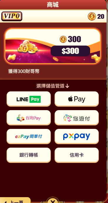玩家只要登入帳號後點選商城頁面,即可看到清楚的儲值面板,像是300元獲得300財哥幣的基礎面額,搭配畫面下方的支付按鈕,可以即時觸發付款請求。這個過程不會跳出LINE好友視窗,也不會要求先加客服好友後再進行操作,看起來就像一般商城的金流機制。