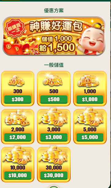 - 上方是限時優惠方案,目前主打的就是「神賺好運包」,即儲值1000元可得1500金幣。