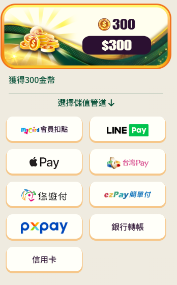 以儲值300元為例,你點選「$300」之後,畫面會跳出金額確認框,標示「獲得300金幣」,下方則是付款管道的選擇介面。
