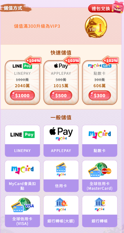 - 第一筆儲值走Apple Pay/LINE Pay快速通道:觸發首儲100%加碼,同時拿到立即回饋金幣。