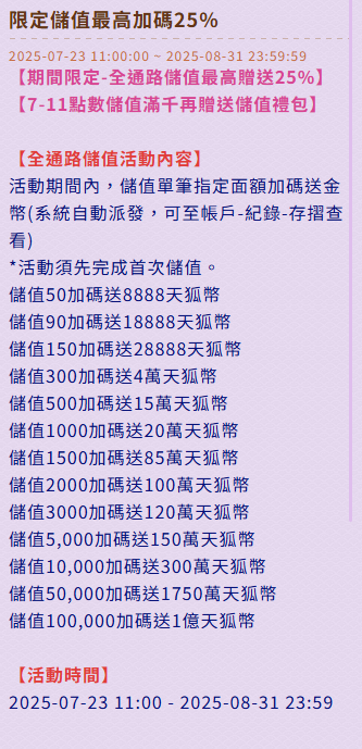 - 儲值10000元送1億天狐幣(此為單筆最高門檻)