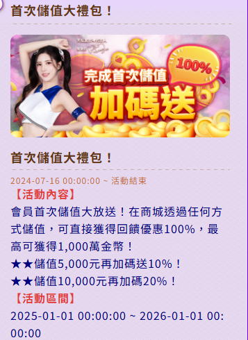 - 儲值滿10000元可再獲得20%獎勵