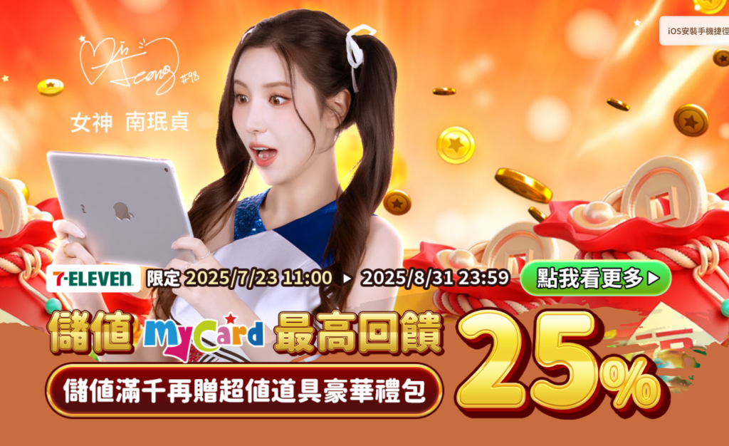 - 第二階段透過MyCard實體卡儲值:疊加25%加碼活動,並可參加7-11通路限定贈送活動。