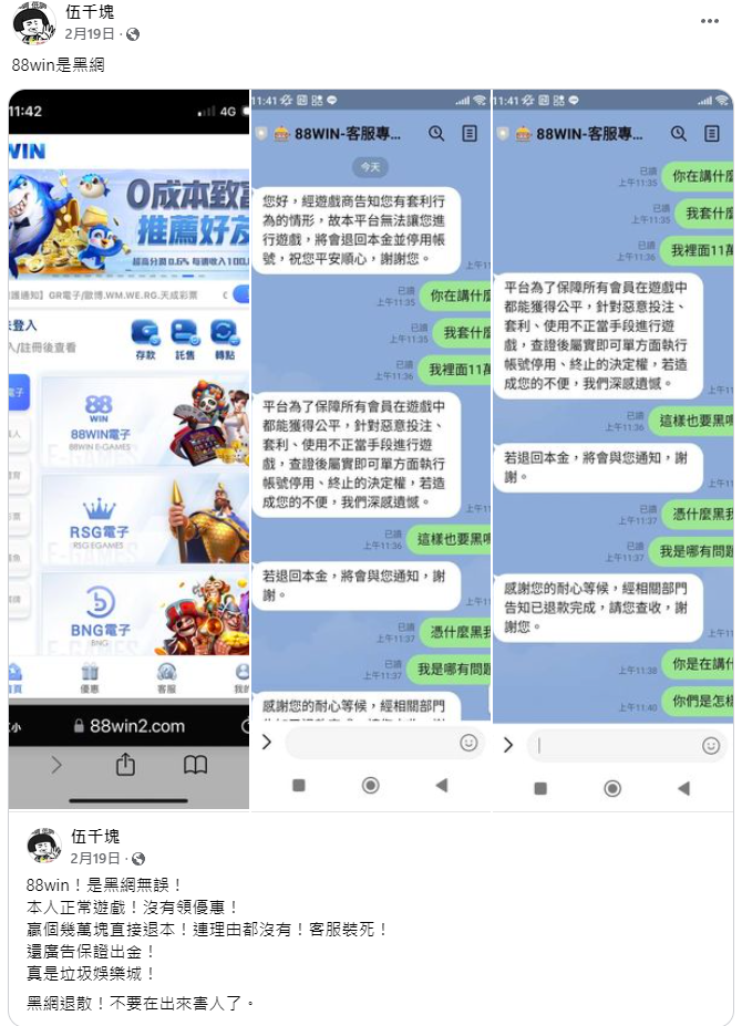 Facebook網友揭露88WIN娛樂城黑網詐騙,贏錢竟只退本金!