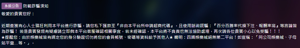 小編在此也要特別提醒各位玩家,面對詐騙的威脅,保持警惕至關重要。千萬不要輕信任何私下匯款的要求,也不要輕易將自己的會員帳號、密碼等資料告訴他人。4C四國娛樂城已經多次強調,平台絕無第二網站或子母站,任何宣稱「同公司娛樂城」的言論都可能是騙局的開端。