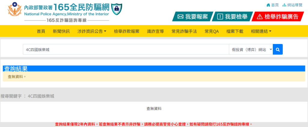 接續上個話題,一開始小編也是完全相信的,畢竟這樣的公告看起來非常正式且專業,但在深入調查後,情況似乎沒那麼單純!小編特地去查了一下165防騙網站,結果讓人驚訝——竟然沒有任何4C四國娛樂城相關的詐騙案件記錄!