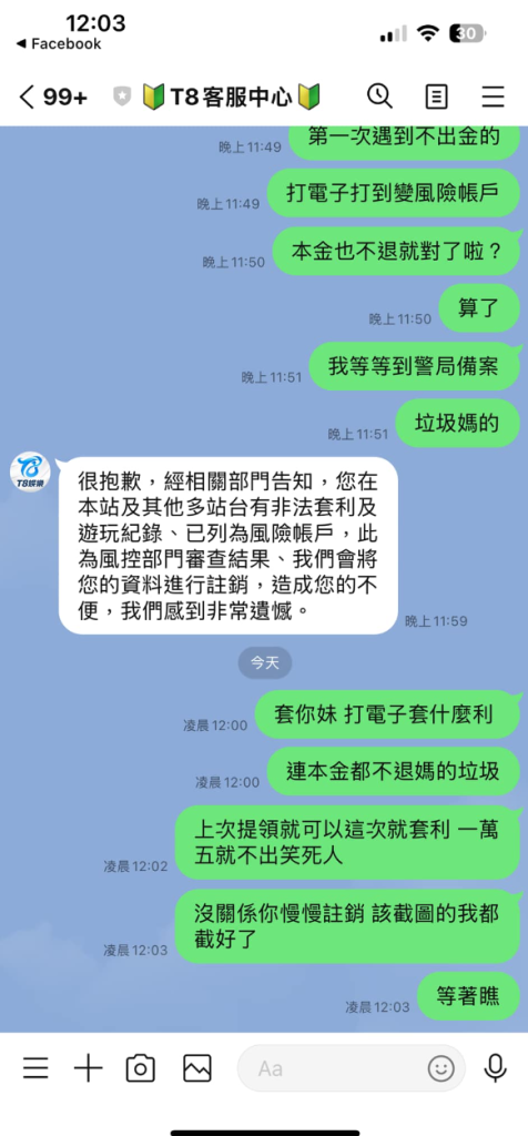 根據聊天記錄,這位玩家反映,他的提現申請被拖延後,客服竟然告知他因為在其他平台上有過“風險帳戶”的紀錄,導致在T8娛樂城的提現被拒絕。這樣的解釋讓人匪夷所思,因為其他平台的操作怎麼會影響到在這裡的正常提現?該玩家的提現要求就這樣被“合理化”地擱置了,無論他如何抗議,最終客服都表示會將他的資料註銷,並結束了對話。