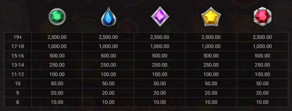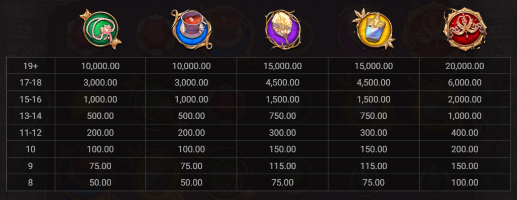相比寶石符號,遊戲中的高價值道具符號提供了更高的賠付。這些道具包括神秘卷軸、華麗的杯子、神奇的書本以及其他象徵力量與財富的物品。這些符號的賠付顯然比寶石類符號更為豐厚,當您連線19個以上這些道具符號時,最高可以獲得20,000倍的賠付,這無疑是巨大的獎勵。