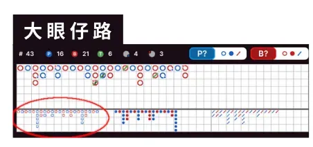 大眼仔路是從大路衍生出來的一種記錄方式,它並不是直接記錄莊家或閒家的勝負情況,而是通過觀察大路的變化來預測接下來的走勢。大眼仔路使用藍色和紅色圓點來標記「是否連續」的情況:藍色表示「穩定」,紅色表示「變動」。具體來說,大眼仔路並不關注莊家或閒家的具體結果,而是根據大路是否出現變化來進行記錄,這也是大眼仔路為什麼需要有基礎牌路分析經驗才能更好掌握的原因。