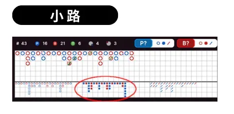小路是從大路的走勢變化中衍生出來的記錄方式,但它並不像大路直接記錄莊家(B)和閒家(P)的勝負,而是通過觀察大路的連續與變動來標記。小路的記錄方式主要使用紅點和藍點來表示「穩定」或「變動」的情況:紅點表示不穩定或變動,藍點則表示穩定或連續的趨勢。