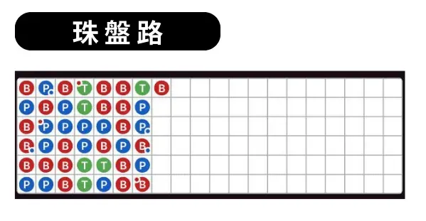 珠盤路是一種紀錄方式,它的表格通常會按順序記錄每一局的結果。每一顆珠子代表一局,並顯示該局是莊贏、閒贏,還是和局。在珠盤路中,通常以紅色表示莊(B),藍色表示閒(P),綠色表示和(T)。這樣的顏色區分方便玩家快速理解每一局的結果,而不用看過多的數據。