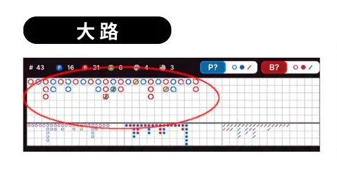 大路是一種記錄莊家和閒家勝負情況的方式,從左到右依序填充,將每一局的結果記錄成一個圓圈,莊家勝利以紅色圓圈表示,閒家勝利以藍色圓圈表示,和局則以斜線或特殊標記記錄,但不算在大路的排列中。