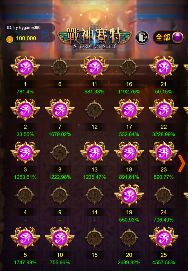 戰神賽特還加入了JP 彩池機制,這對我來說簡直是遊戲的另一層吸引力所在。只要在遊戲面板中湊齊八個相同的圖案,就能觸發特殊的消除效果,並有機會挑戰彩池獎金。我覺得這個設計特別能激發玩家的興奮感,因為你永遠不知道下一次旋轉是否會迎來一次改變命運的超級獎金。