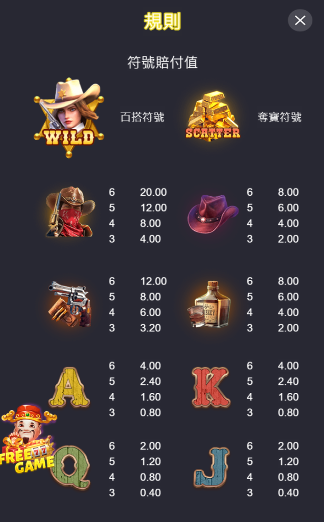 看一下這款遊戲的賠付表,可以發現一些有趣的規律。牛仔頭像的符號是高價值符號,當你在畫面上出現六個牛仔頭像時,可以贏得20倍的獎金。我個人覺得,這個倍率在老虎機中已經算是相當誘人了!如果再搭配一些WILD符號,獎金會更加驚人。