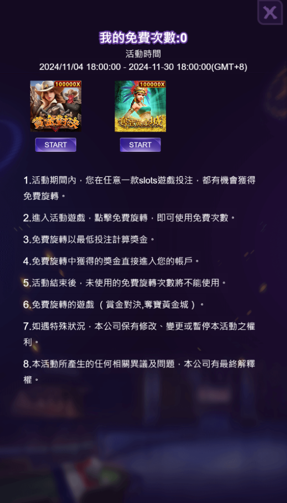 在活動期間(2024/11/04 18:00 – 2024/11/30 18:00),只要你在任何一款遊戲中下注,就有機會獲得免費旋轉次數。當然,《賞金對決》作為活動中的推薦遊戲之一,憑藉其豐富的獎金機制和刺激的玩法,無疑是參與活動的最佳選擇之一。