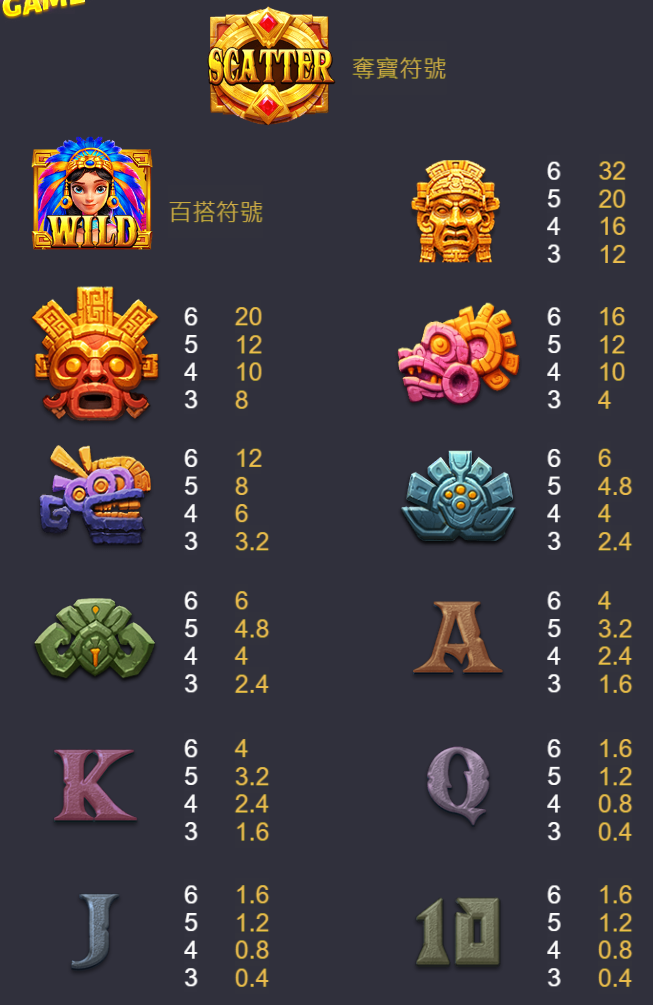 一進入遊戲,玩家便能感受到濃厚的瑪雅文化氛圍。背景的古代遺跡設計搭配雕刻精美的圖騰符號,每一次旋轉都像是在揭開一段塵封的歷史。紅色、紫色、金色的符號以層次分明的方式呈現出來,既能讓人眼前一亮,又不會讓人覺得視覺疲勞。我認為,這樣的配色和設計非常用心,既凸顯了遊戲主題,又讓人沉浸其中,彷彿自己就是探險隊的一員。