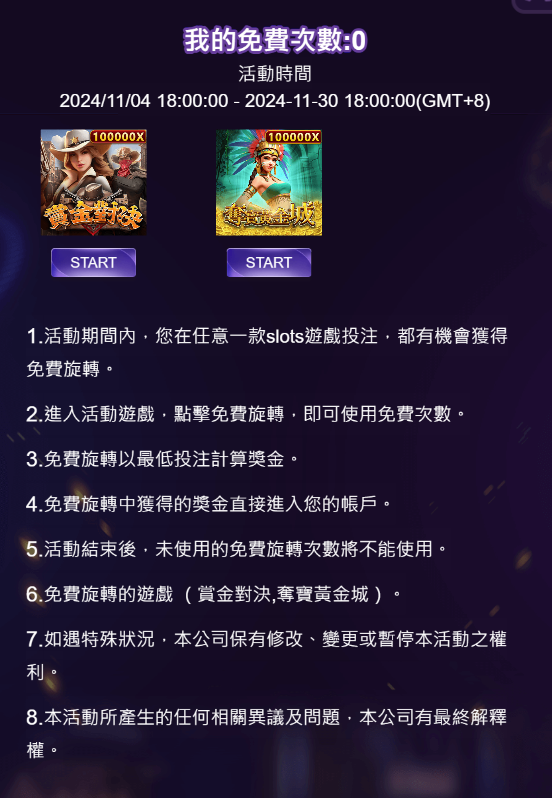 活動時間是 2024年11月4日18:00至2024年11月30日18:00,為期近一個月,讓所有玩家都能有充足的時間參與。在此期間,玩家只需要在任意一款GB電子的遊戲中下注,就有機會獲得免費旋轉次數。