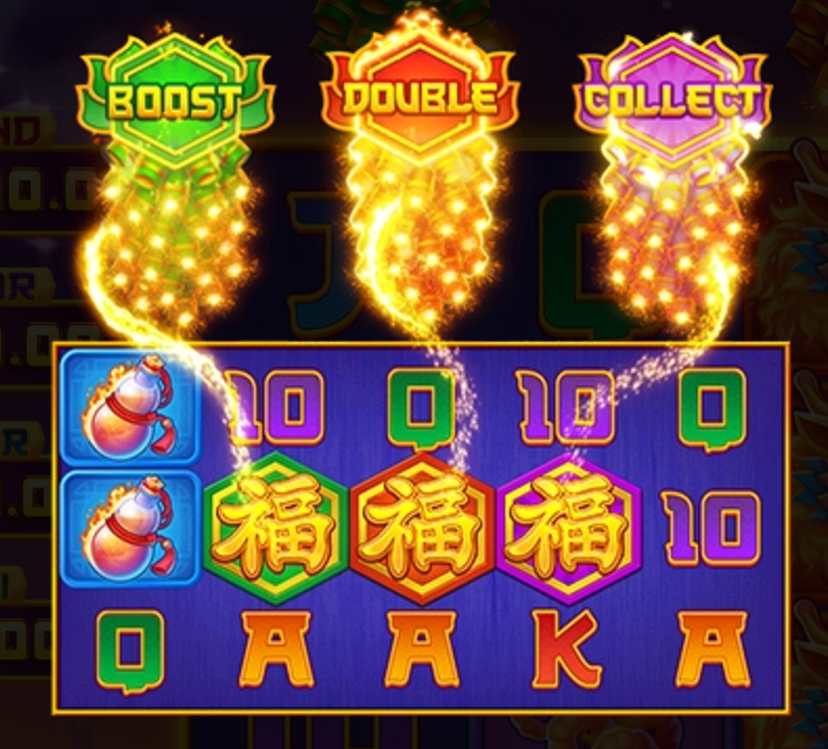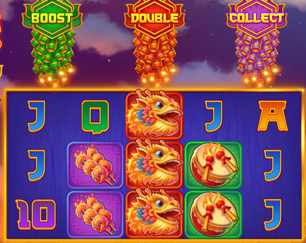 最引人注目的莫過於畫面上方的三個標籤——BOOST、DOUBLE和COLLECT。這些標籤以耀眼的金黃色煙花為背景,搭配鮮明的文字,讓人不由自主地聯想到年節時的鞭炮與慶祝活動。這不僅為遊戲增添了熱鬧的氛圍,也暗示了它的特殊功能設計,讓玩家更加期待觸發這些效果。