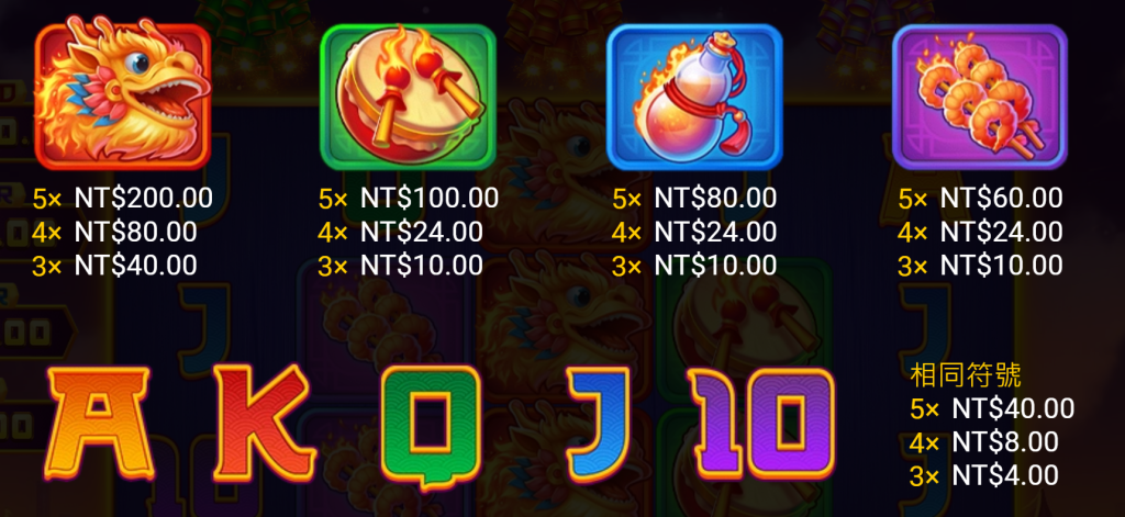 其次,主遊戲畫面的符號也充滿了節慶味道。例如,那條充滿活力的紅色龍圖案,象徵著中國傳統中的吉祥與熱鬧;而綠色背景上的擊鼓圖案,則充滿了年節的儀式感,讓玩家仿佛能聽見擊鼓聲迴盪在耳邊。此外,紫色背景上的串燒符號,充滿了市集與慶典的氛圍,讓人聯想到在街頭小攤上享用美食的愉快時光。