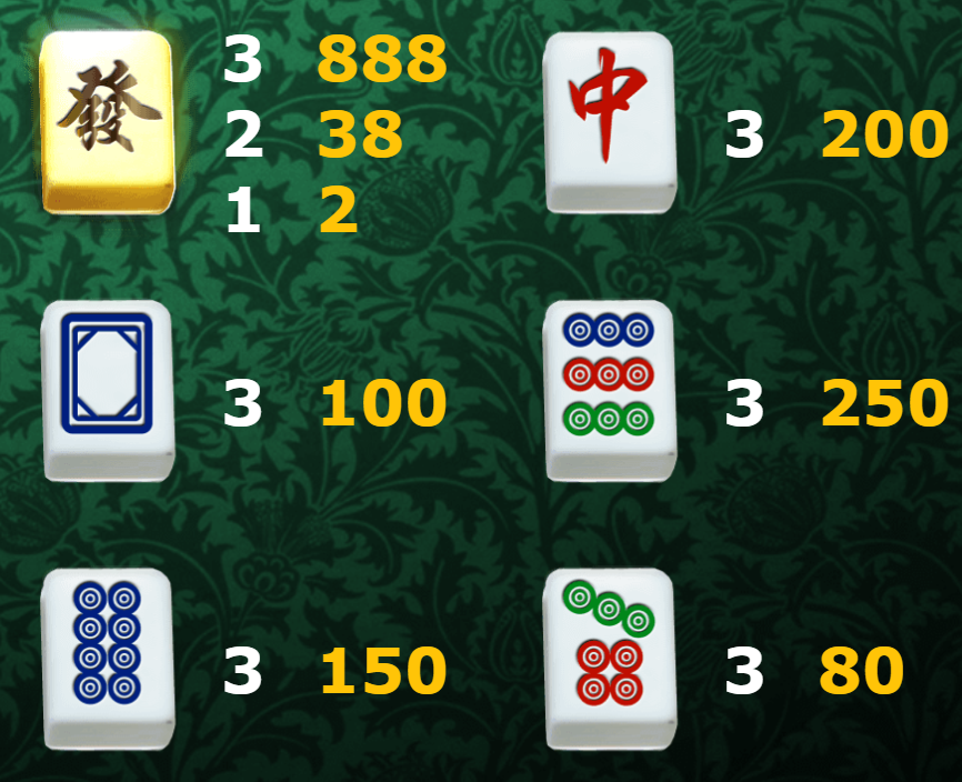 其他麻將圖案的賠付範圍廣泛,如3個藍白色的五筒可賠付150倍,紅藍綠混色的圖案提供250倍的高額獎勵。