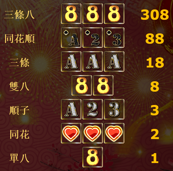 賠付表中的最高組合「三條八」以驚人的308倍 賠付遙遙領先,這不僅展現了數字「8」在遊戲中的主導地位,也充分激發了玩家的挑戰慾望。其次,「同花順」和「三條」分別提供88倍和18倍的賠付,這些獎金讓玩家在追求高額獎勵的同時,也能享受獲得中等獎勵的成就感。