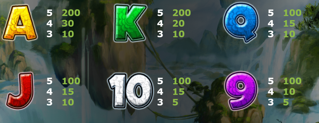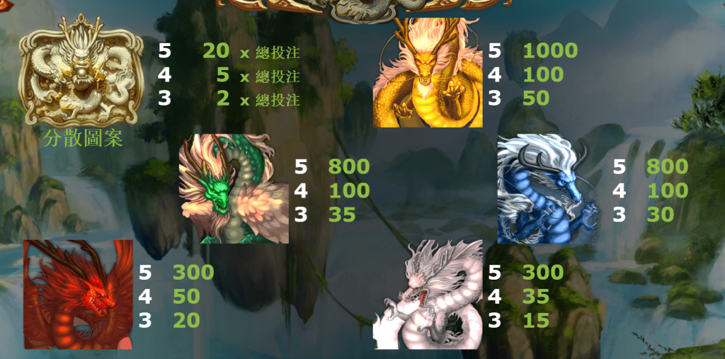 在主要符號中,四種龍形圖案分別代表不同的賠付級別,其中金龍為最高賠付,連續5個金龍即可獲得高達1000倍的投注回報。其他龍形圖案,如綠龍與白龍,也擁有不錯的回報,讓玩家有多種賠付選擇。