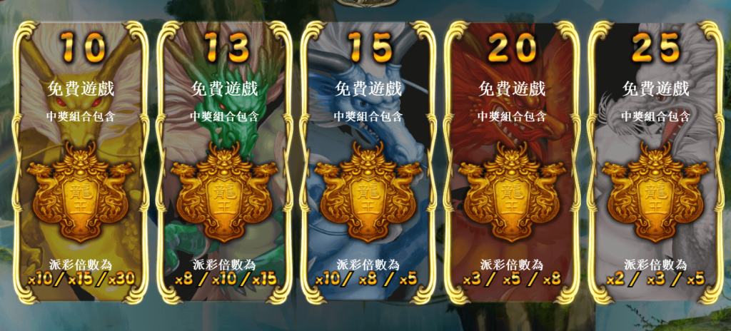 - 白龍則提供最多25次免費遊戲,倍數在2至5倍之間,適合喜歡長時間遊戲的玩家。