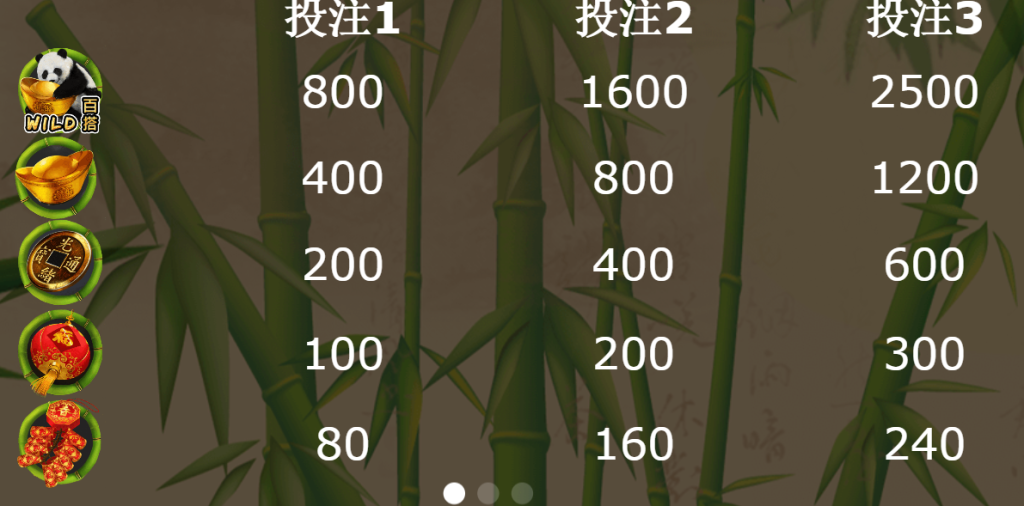 百搭圖案以熊貓抱著金元寶作為主要設計,非常可愛且具有文化象徵意義。這個符號是整個遊戲中最高賠付的象徵。當玩家在最高投注(投注3)中收集五個百搭圖案時,可獲得高達2500倍的投注回報。這種高獎勵的設計,我認為讓遊戲更具挑戰性與吸引力。