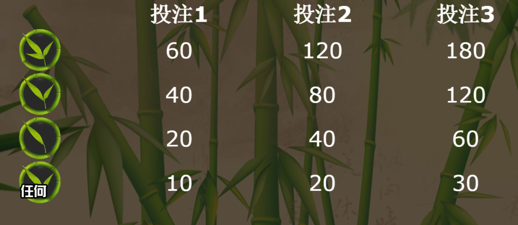 大熊貓遊戲是一款以竹林與熊貓為主題的經典線上娛樂遊戲,其簡單卻吸引人的設計讓玩家感受到濃厚的東方氛圍。我認為,這款遊戲的賠付表設計明確且清晰,幫助玩家快速理解不同投注等級下的獲勝組合和對應賠率。