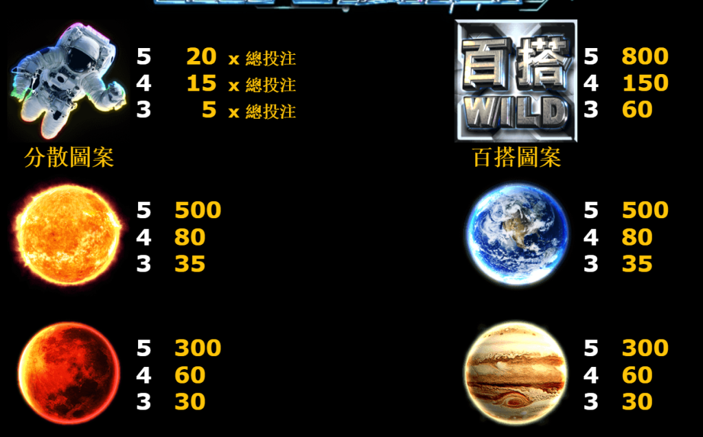 我覺得《銀河瘋爆》的賠付設計充分展現了太空主題的魅力與機會,對玩家來說這是一款極具吸引力的遊戲。從整體賠付機制來看,它結合了高價值的「百搭圖案(WILD)」和「分散圖案(SCATTER)」,讓玩家在追逐高額獎金時還能享受豐富的視覺體驗。