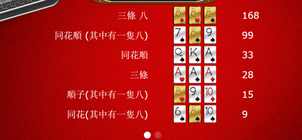 - 順子(包含一雙八)的賠率是15倍,這是一個中等回報的組合,對於新手玩家來說可能更容易追求。