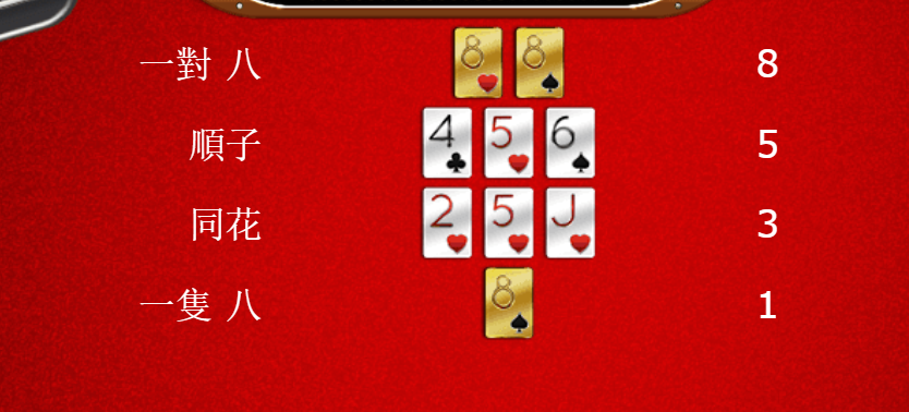 - 如果只有一雙八,則僅有1倍的賠付。這部分我認為是對於玩家基本投入的一種補償。