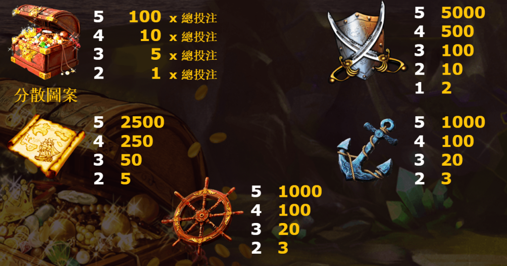 - 船舵與錨:這兩個符號賠付相對中等,五個同時出現時可獲得1000倍回報,且頻率較高,適合作為玩家的穩定收益來源。