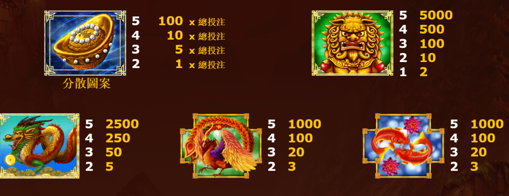 • 紅色火龍與金色鳳凰次之,最高賠付分別達到2500倍與1000倍。