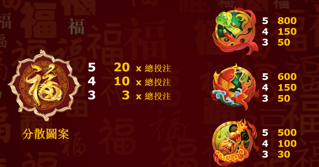 遊戲中的「百搭圖案」功能尤為實用,可代替其他圖案(分散圖案除外),幫助玩家組成更多的獲勝組合。此外,出現的「福字圖案」更有機會觸發特殊的免費遊戲功能,進一步提高遊戲的趣味性與贏獎機會。