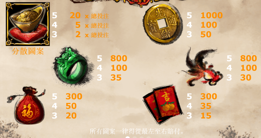 在遊戲中,金元寶作為分散圖案,提供了極具吸引力的賠付。當玩家達到以下條件時,將獲得倍數加成: