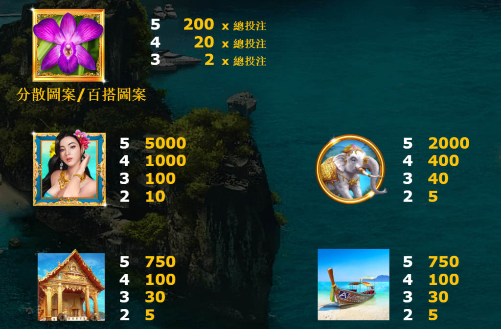 主要的高賠付圖案由泰國的典型元素組成,包括象徵財富的金象和曼妙的泰國女子。泰國女子圖案為最高賠付,當玩家收集到5個時,可獲得投注金額的5000倍,這樣的獎金我認為已足以成為吸引玩家重複遊玩的理由。