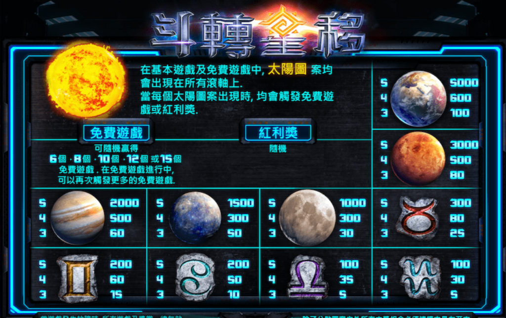 遊戲中的高價值符號包括地球、火星、木星與水星,這些行星象徵著高額回報:
