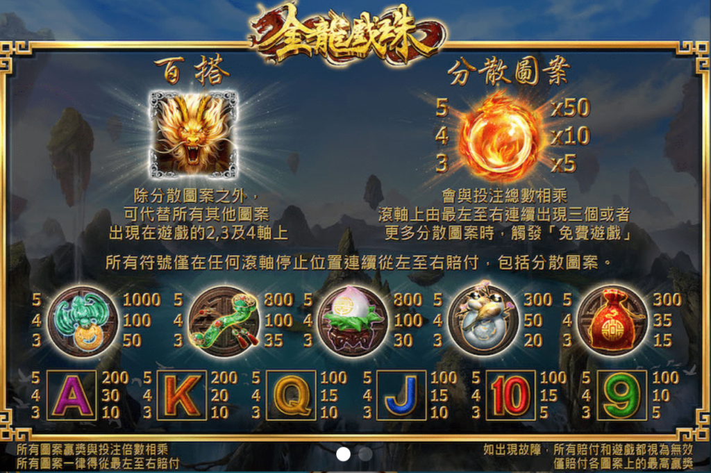 《金龍戲珠》的賠付圖結構合理,既提供了高價值符號的巨額回報,又通過百搭符號和分散符號的功能,為玩家創造了更多的中獎機會。此外,免費遊戲與分散符號的搭配,讓遊戲更加刺激與多變。