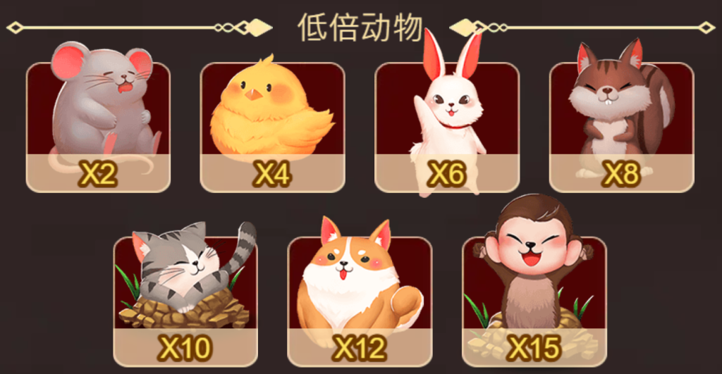 倍率從2倍的小老鼠到15倍的小猴子不等。這些角色的出現頻率較高,適合喜歡穩定收益的玩家。我覺得低倍動物的可愛設計不僅增加了遊戲的趣味性,也讓人對敲擊它們的過程充滿期待。
