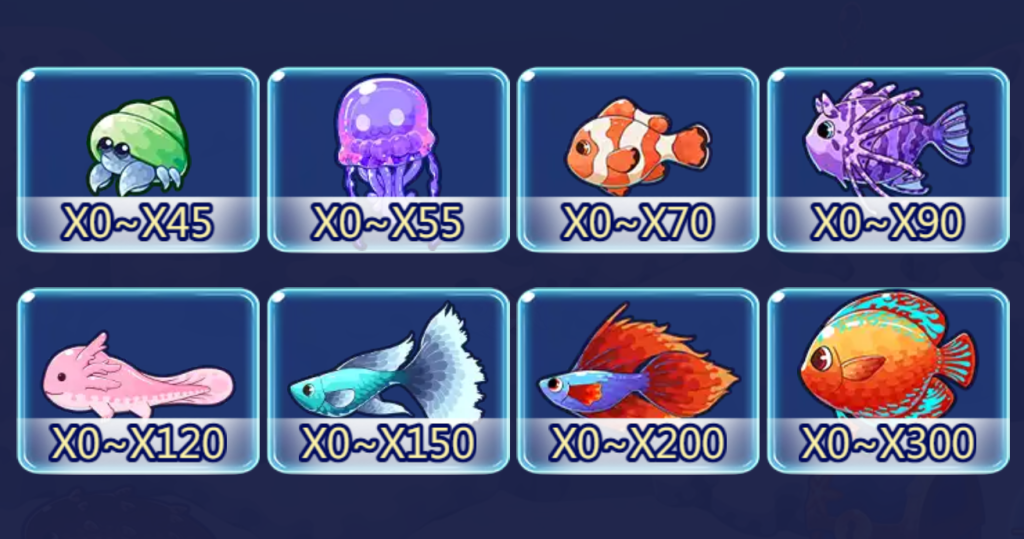 遊戲中的魚類分為多種等級,從普通小魚到稀有魚種,賠付範圍涵蓋了0到300倍不等。像普通金魚倍率為0到10倍,隨著魚類等級提升,例如水母可以達到0到55倍,而錦鯉更是高達0到300倍。我認為這樣的設計充分考慮了玩家的成長體驗,讓大家在每一步都能感受到成就感。
