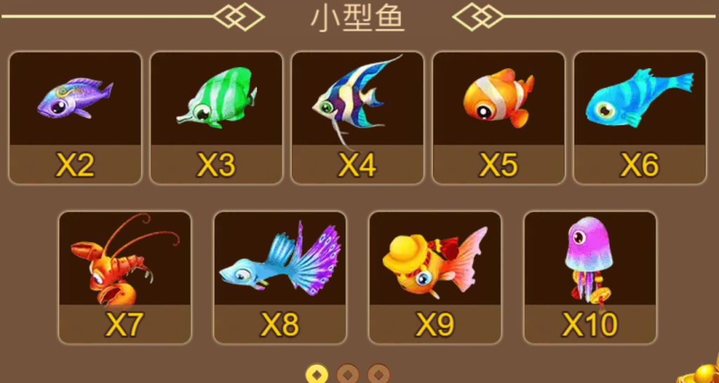 - 小型魚:如紫色小魚倍率為X2,而華麗的水母可以高達X10。這類魚容易捕獲,是玩家起步階段的首選。