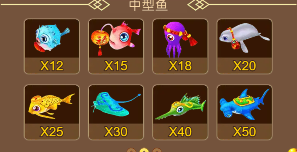 - 中型魚:如金色鯉魚可達X25,藍色電鰻達到X50。這些魚需要稍強的火力,但收益相對更高。
