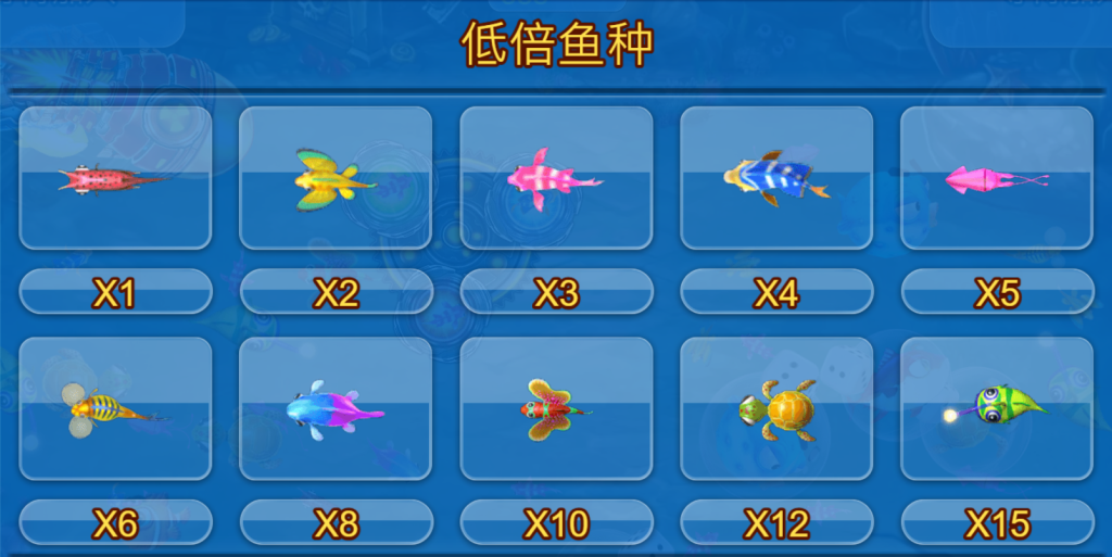 低倍魚種的倍率範圍從X1到X15,這些魚的特徵是數量多且捕獲難度低。我覺得這是非常貼心的設計,特別是對於剛入門的玩家,這些魚提供了穩定的收益來源。像X8的粉藍小魚和X12的海龜,不僅造型可愛,還能讓玩家快速積累資金,逐步提升遊戲體驗。