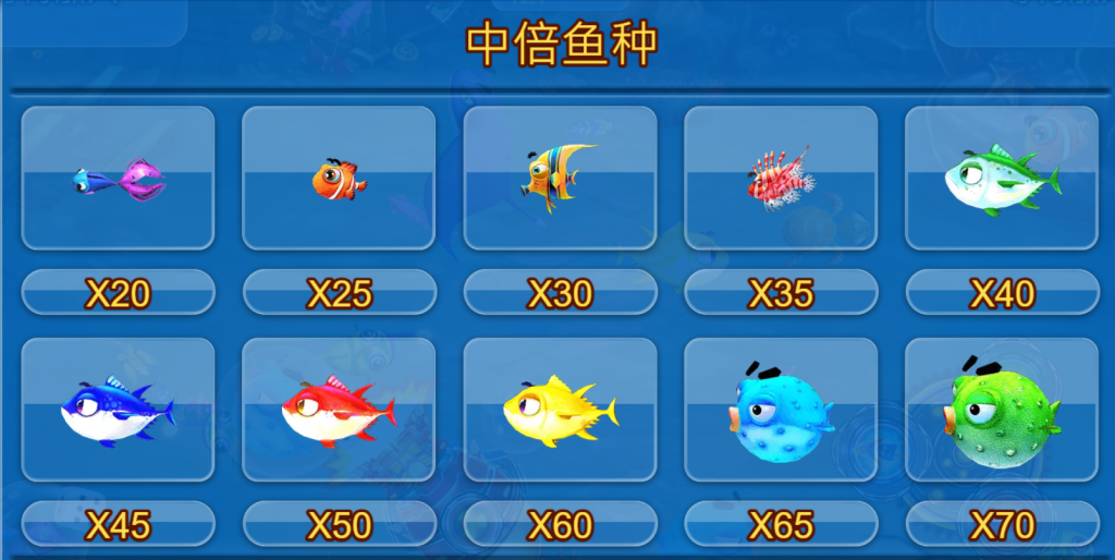 中倍魚種是遊戲的核心層次,賠付範圍從X20到X70。這些魚群通常需要更精準的操作和合適的武器使用。例如,X30的黃藍小魚和X50的紅色大魚,它們的獎勵回報更高,但捕捉難度也相應增加。我認為,這部分設計對於進階玩家來說特別有吸引力,因為它們提供了穩健的挑戰和獲勝的滿足感。