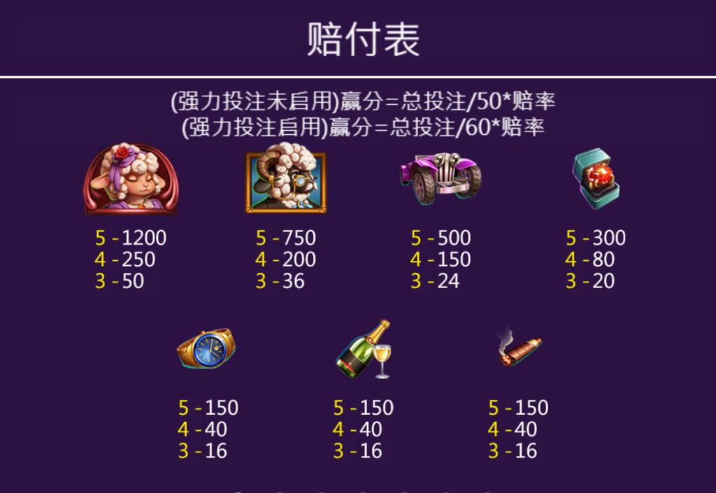 遊戲中,賠付最高的符號為紅羊和金羊。當出現5個紅羊符號時,可獲得高達1200倍的賠付,而金羊符號則提供750倍的回報。我覺得這樣的設計象徵著財富與榮耀,每當紅羊或金羊組合即將成型時,總能讓人屏息期待。同時,這些符號也提升了遊戲的挑戰性,激勵玩家不斷追求更高的收益。
