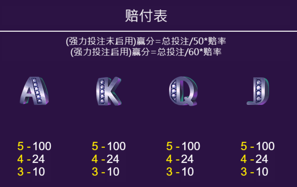 A、K、Q、J等字母符號是遊戲中最基本的符號,但它們的出現頻率高,賠付範圍在10到100倍之間。我認為這些符號雖然收益較低,但在多線玩法中起到了關鍵的搭配作用,能有效填補空白,提高整體賠付機會。