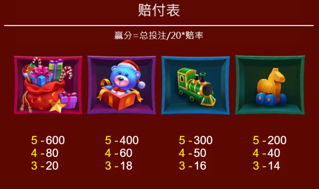 首先,最引人注目的是高價值符號,例如裝滿禮物的聖誕紅袋,對應5個符號時可獲得600倍的賠付。其次是可愛的藍色小熊,為5個符號提供400倍賠付。其他例如綠色火車和黃色木馬則分別提供300倍和200倍的賠付,讓人每次旋轉都充滿期待。我認為這些高價值符號代表了節日中孩子們收到禮物的快樂,也讓遊戲的氛圍更加溫馨。