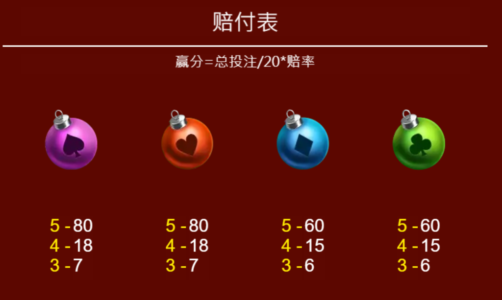 遊戲並沒有忽視低價值符號的設計,例如紫色、橙色、藍色和綠色的聖誕球,它們的賠付範圍雖然較低(5個符號分別提供80倍至60倍的賠付),但其出現頻率更高。我覺得這樣的設計不僅平衡了遊戲的節奏,也增加了玩家的參與感,即使是低價值符號也能時常為玩家帶來小確幸。